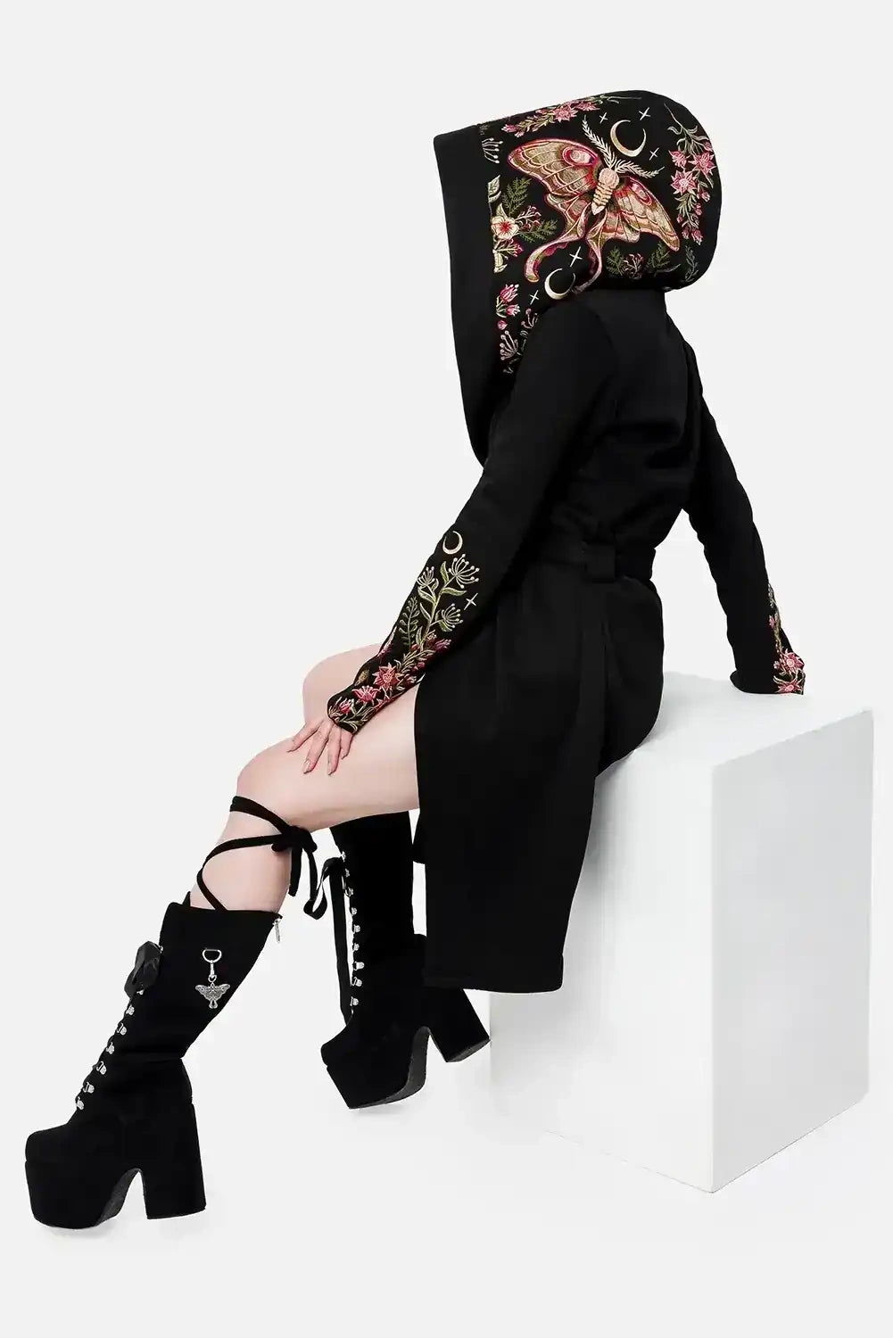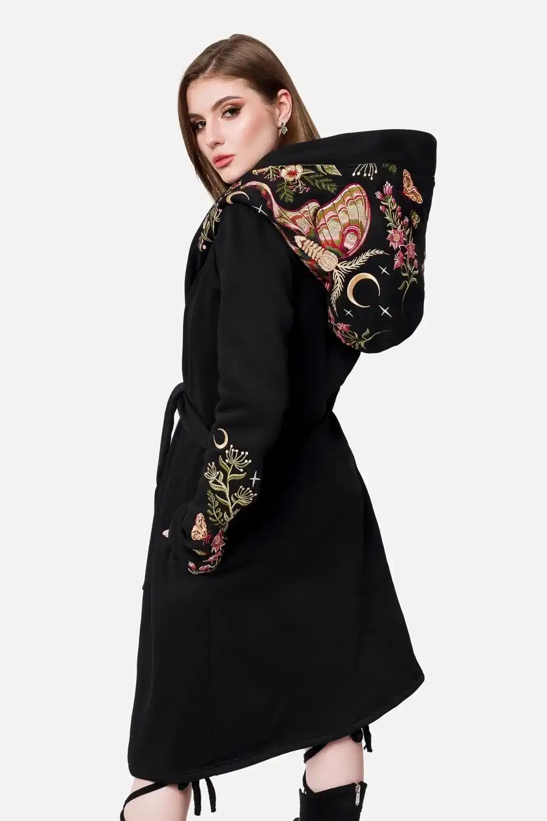 フードにはルナモスや花々、三日月が繊細に刺繍され、まるで秘密の森をまとっているかのような神秘的な佇まいを演出します。