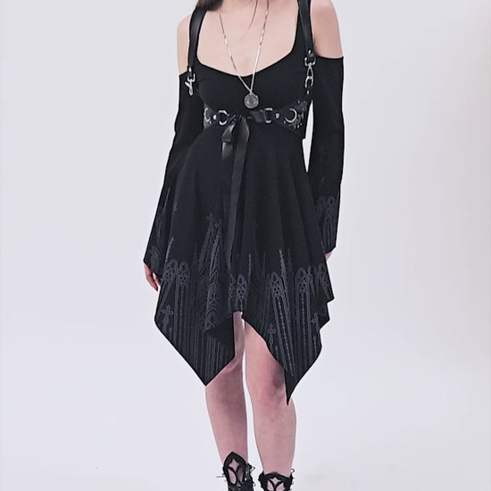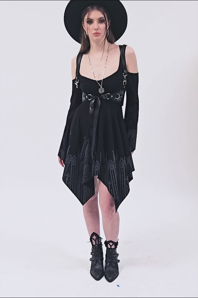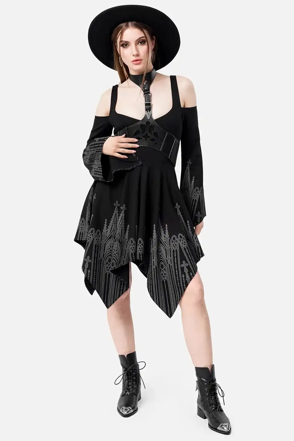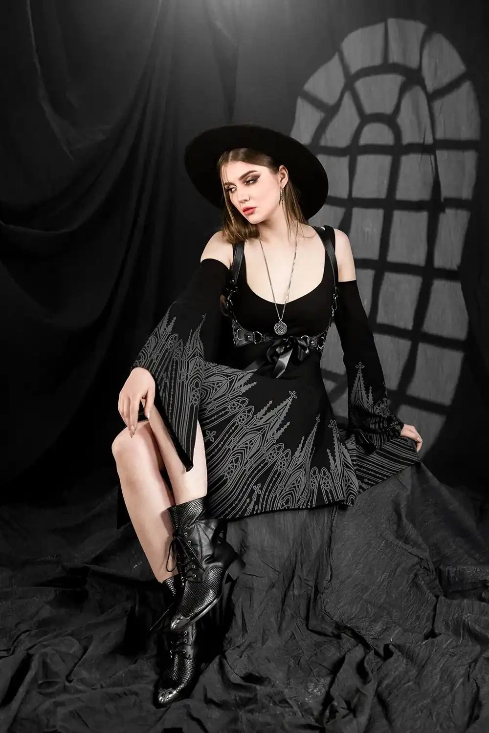 🌙🕯️ INFERNAL CHAPEL MINI DRESS – ゴシック大聖堂プリントドレス 🕯️🌙