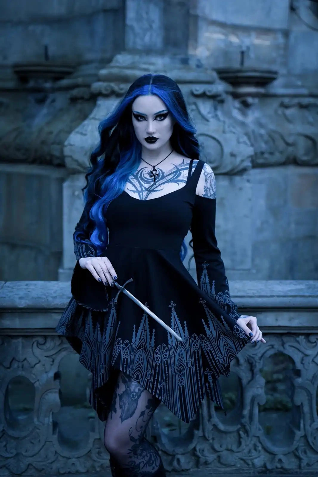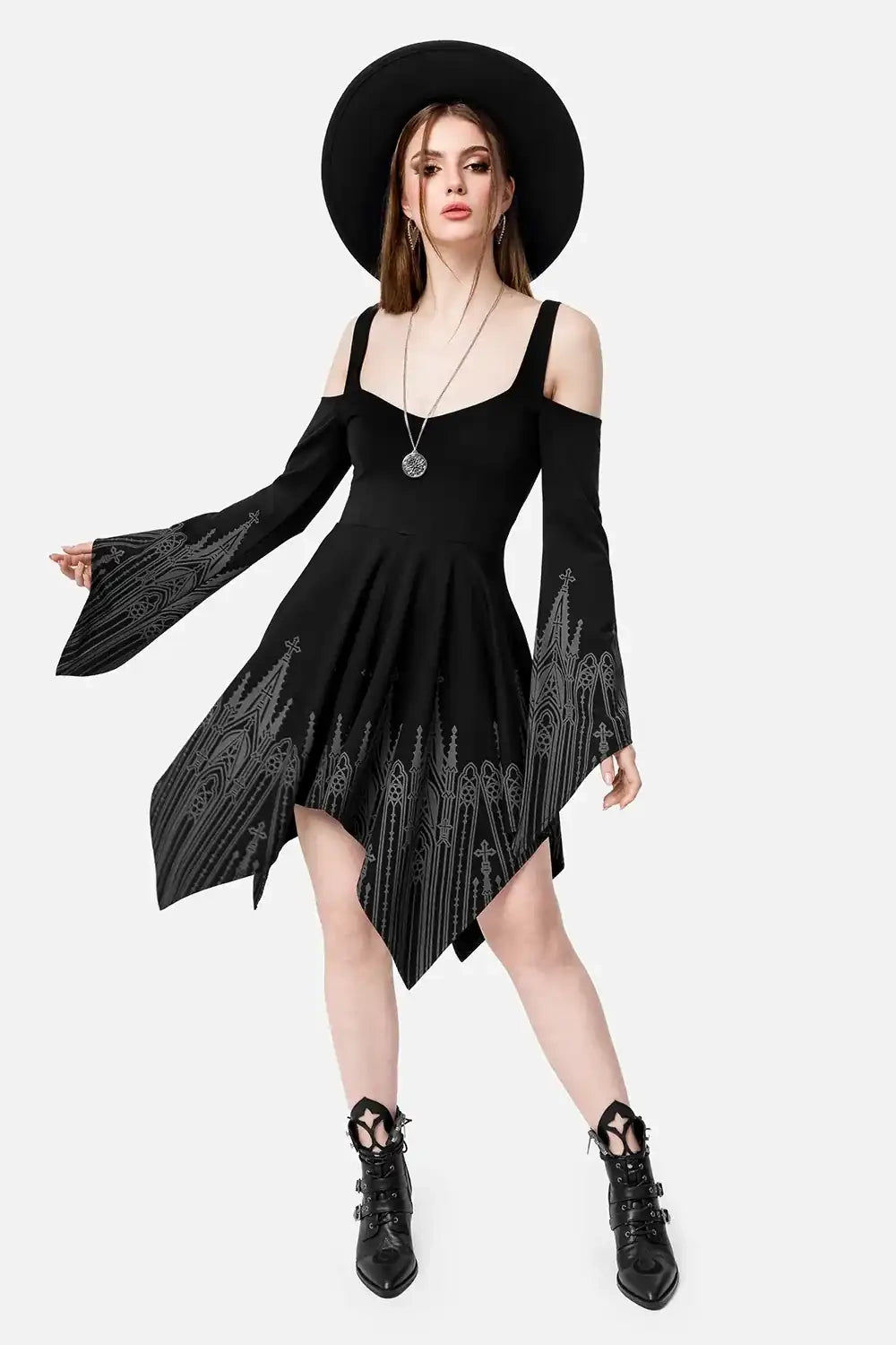 漆黒のドラマと神秘をまとう、ゴシック調コールドショルダードレス。