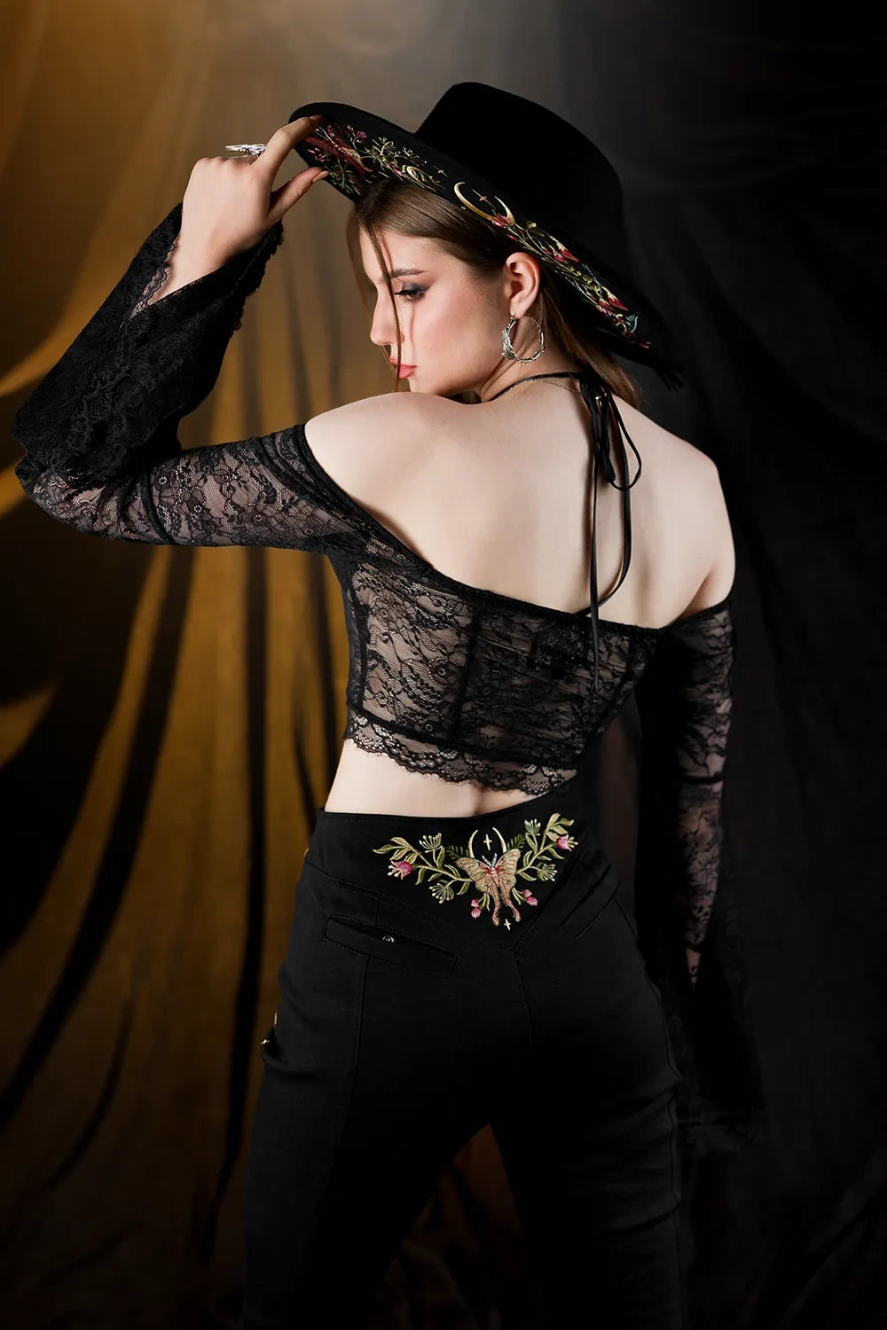 漆黒のデニムに、蛾と草花の刺繍が浮かび上がるように施され、