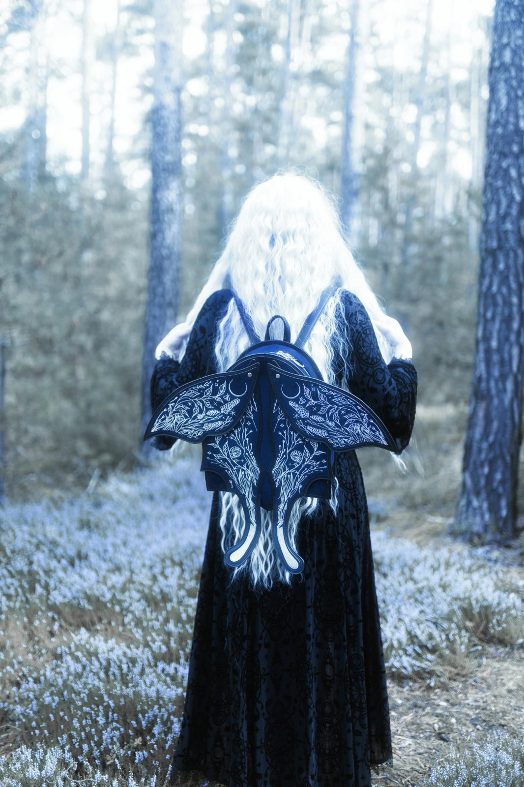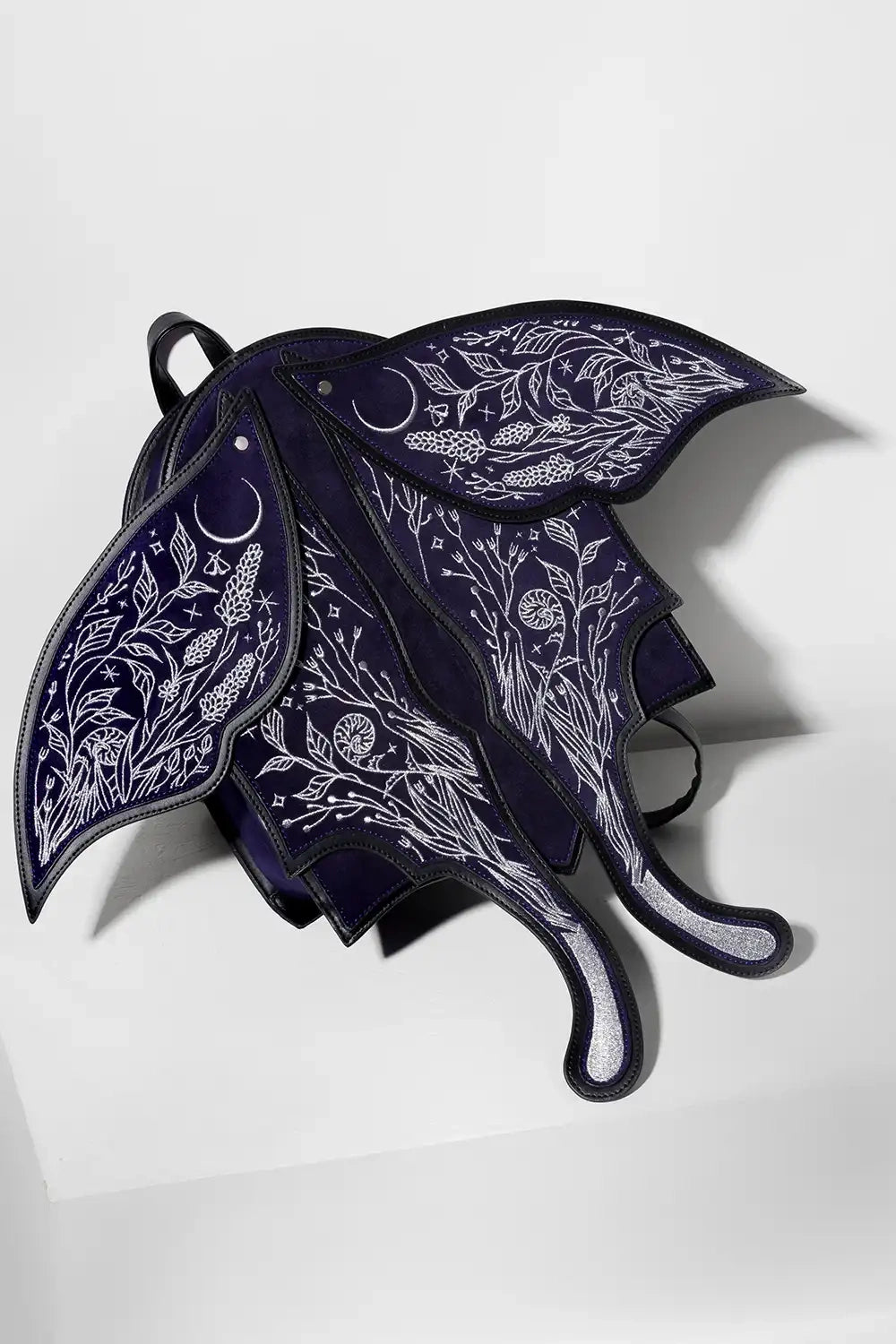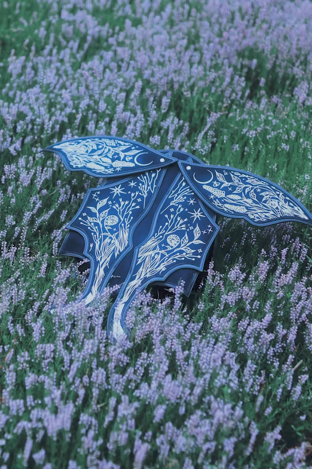 ダークブルーのフェイクスエードにシルバー刺繍を施したこのファンタジーバックパックは、ウィムジゴスとダークフェアリーコアの美学を融合。