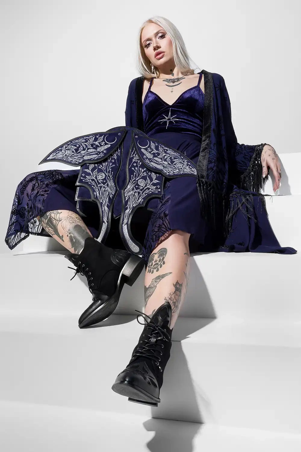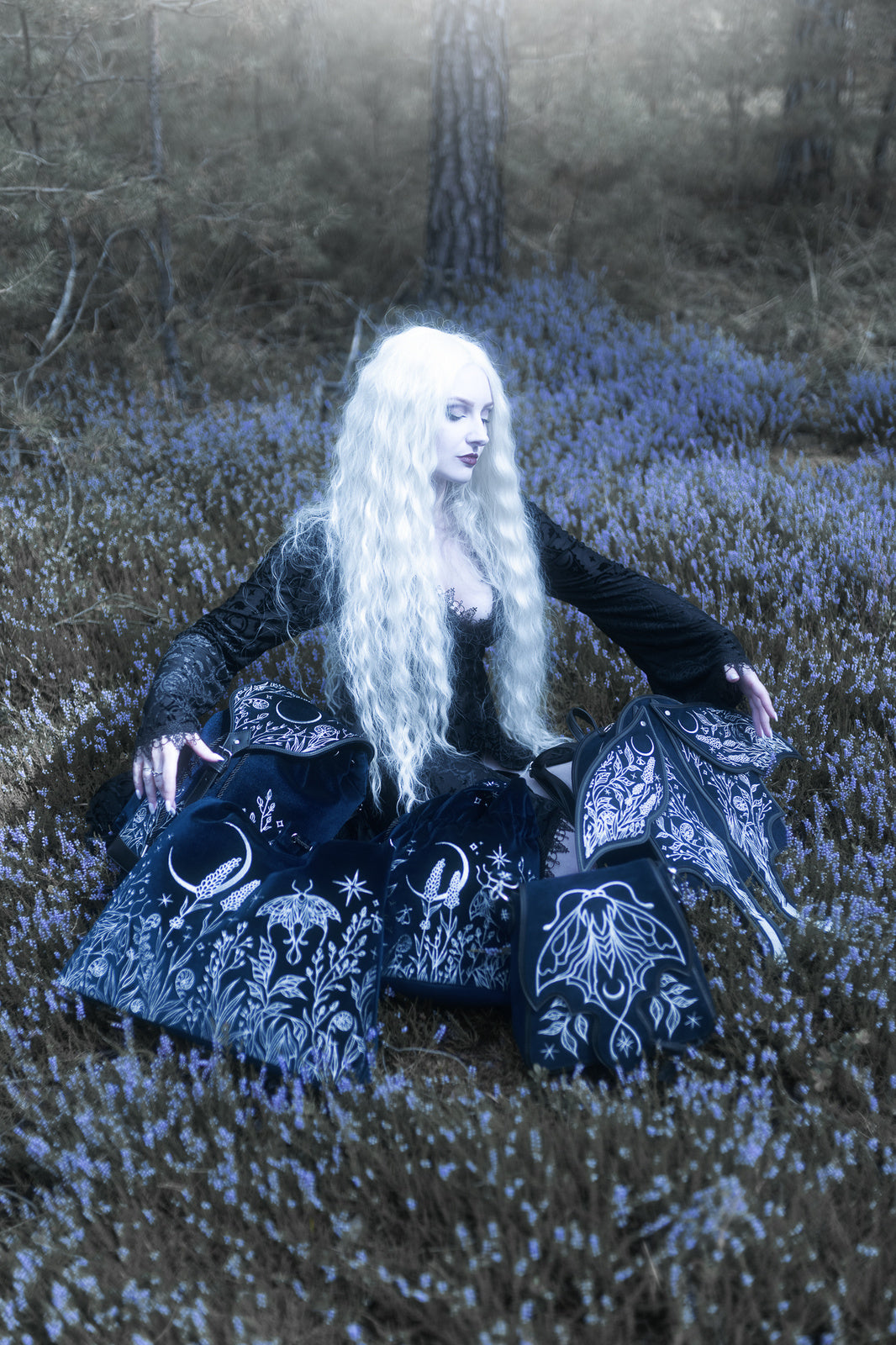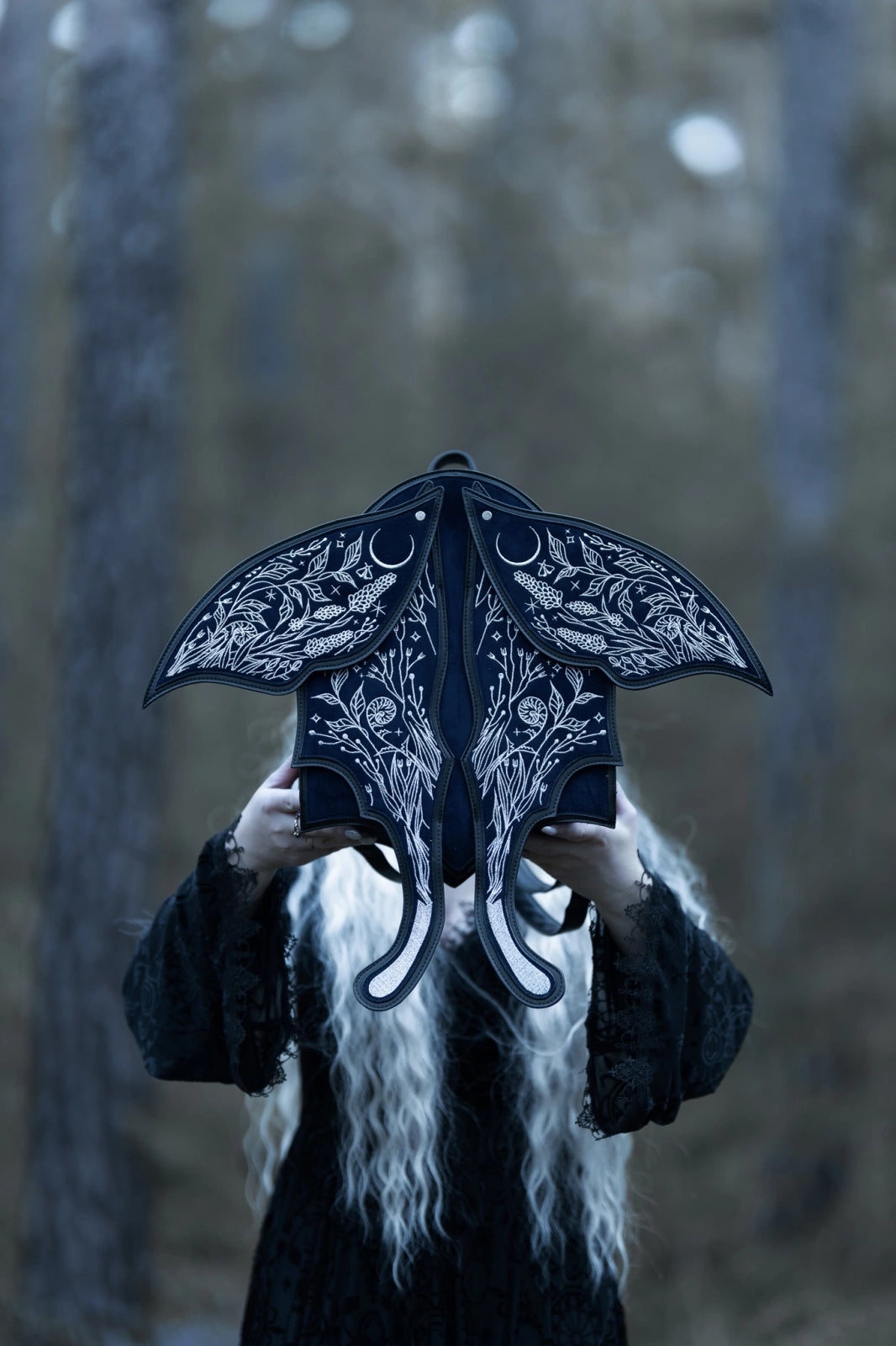ダークブルーのフェイクスエードにシルバー刺繍を施したこのファンタジーバックパックは、ウィムジゴスとダークフェアリーコアの美学を融合。