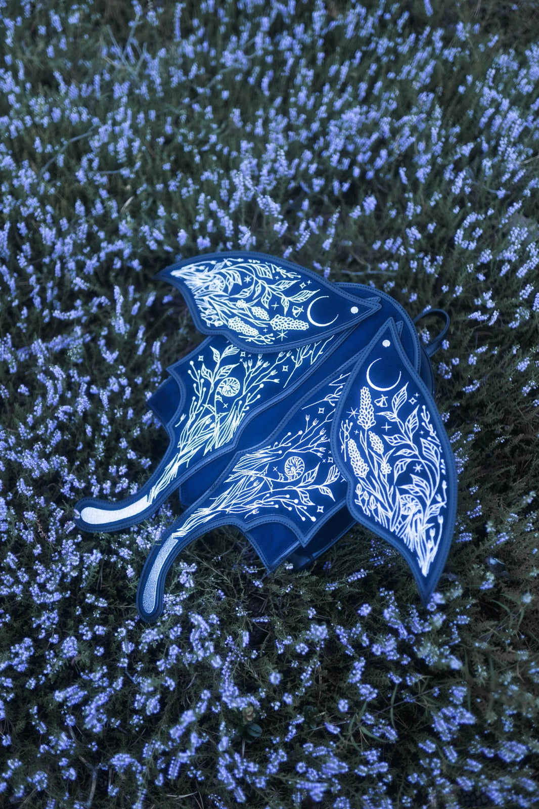 ✦ 夜に咲く花、三日月、星々をシルバーメタリック刺繍で表現したミッドナイトブルーのフェイクスエード