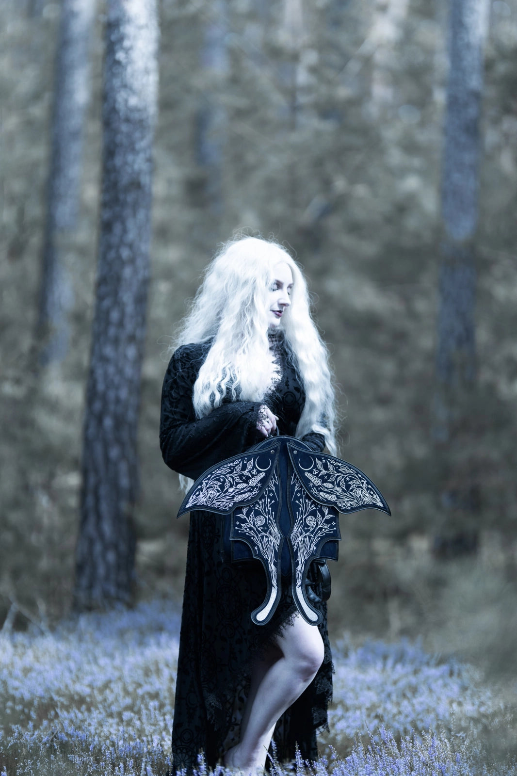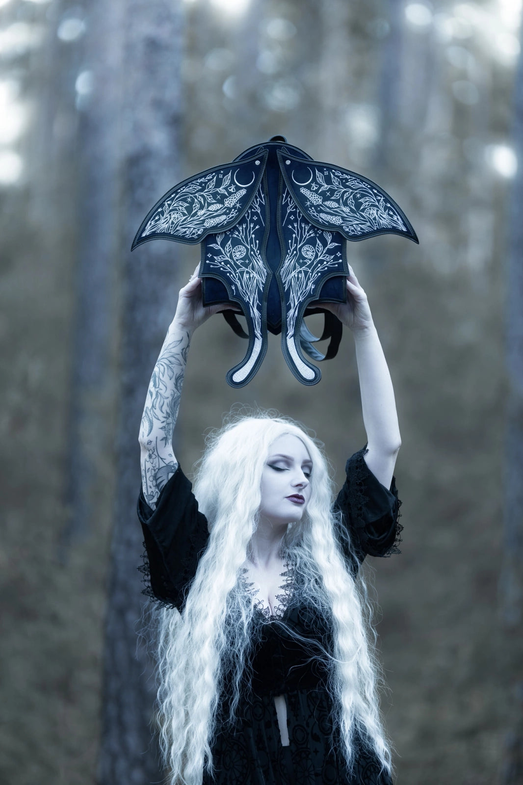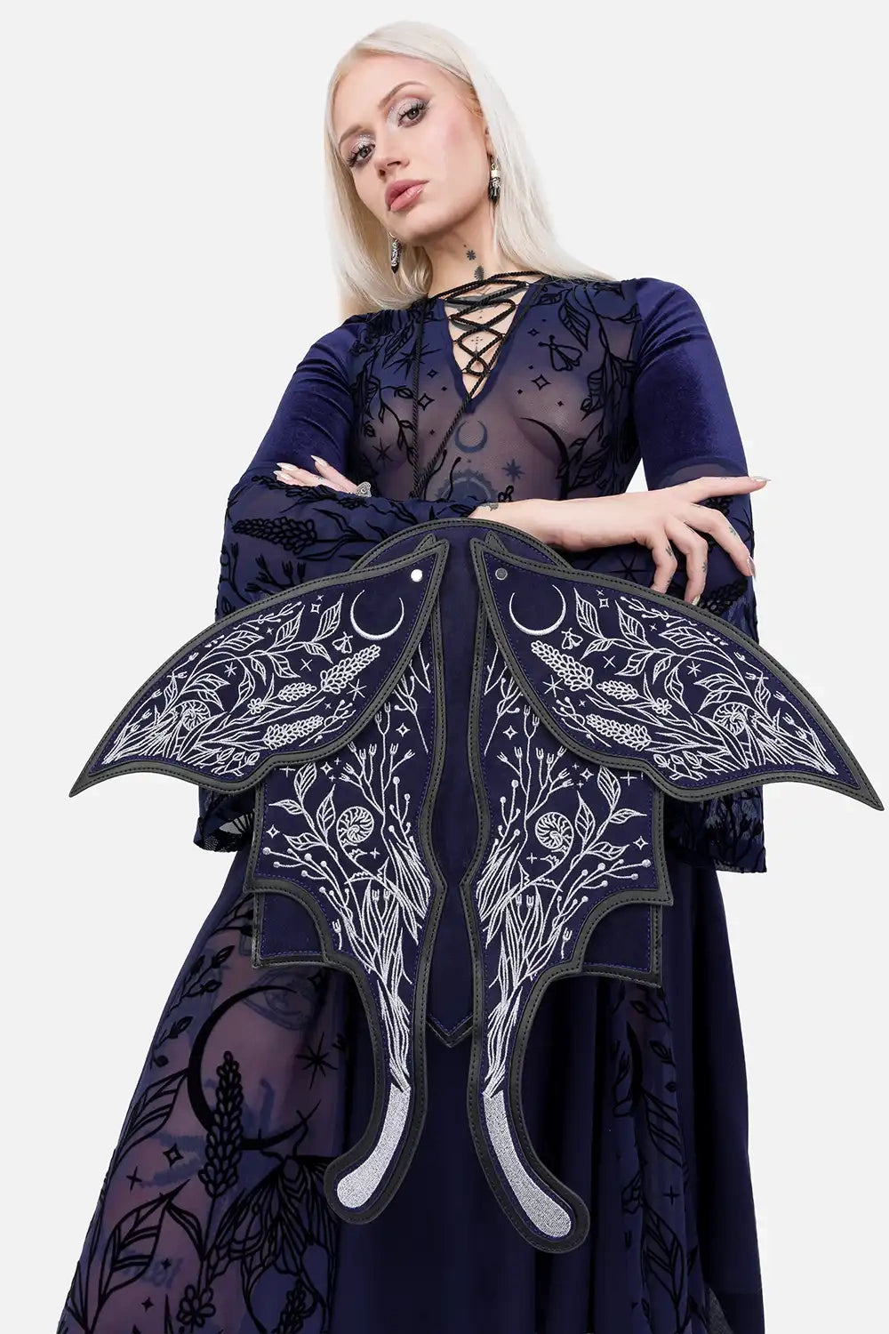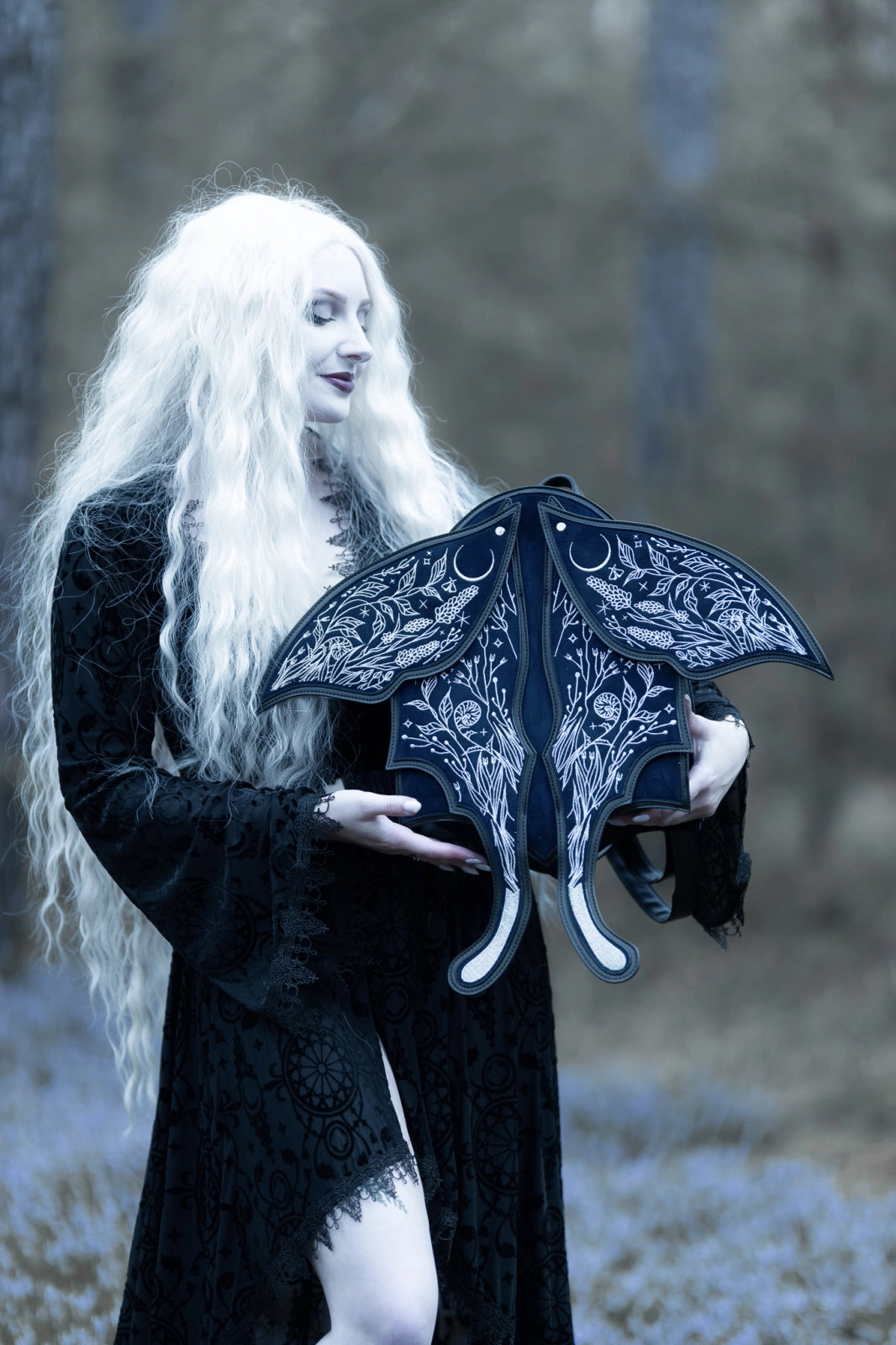 シルバー糸で繊細に刺繍された3Dの羽には、夜に咲く花々、三日月、星々が描かれ、光を受けて静かにきらめきます。